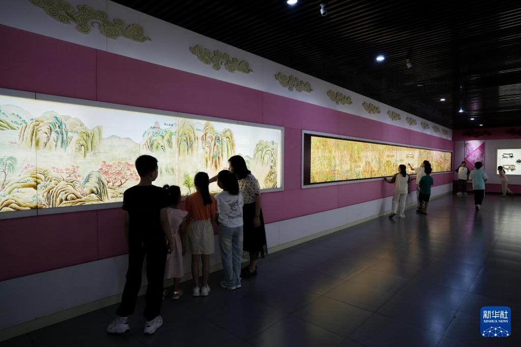 7月21日,孩子们在中国滦州皮影博物馆内参观皮影长卷。