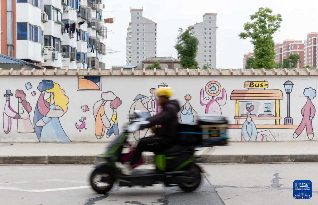 10月9日,一名男子驾驶电动自行车从上海光华创意街区一处艺术涂鸦墙前经过。
