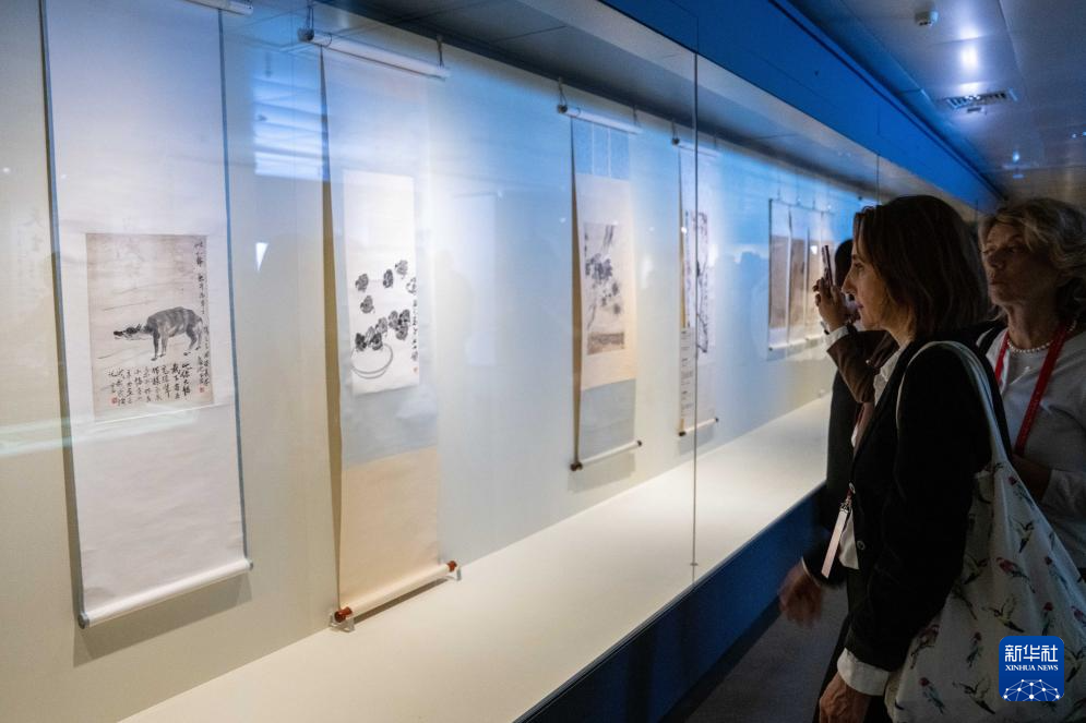 11月5日,在湘潭市博物馆,观众在观看齐白石作品。