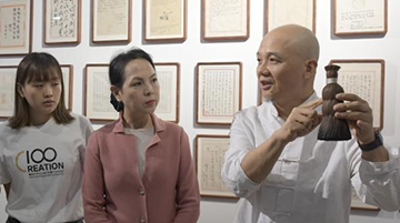 11月11日,参展艺术家(左一)在叶氏宗祠向观众介绍作品。