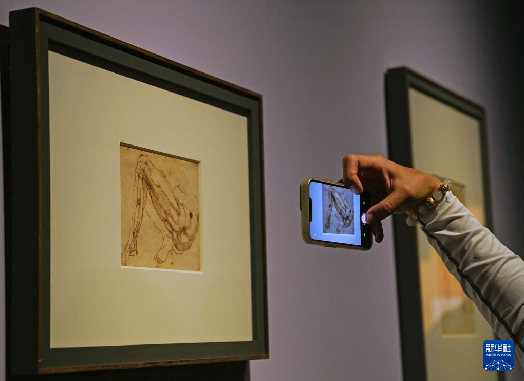 12月10日,观众在拍摄展出的米开朗基罗的素描《腿》。