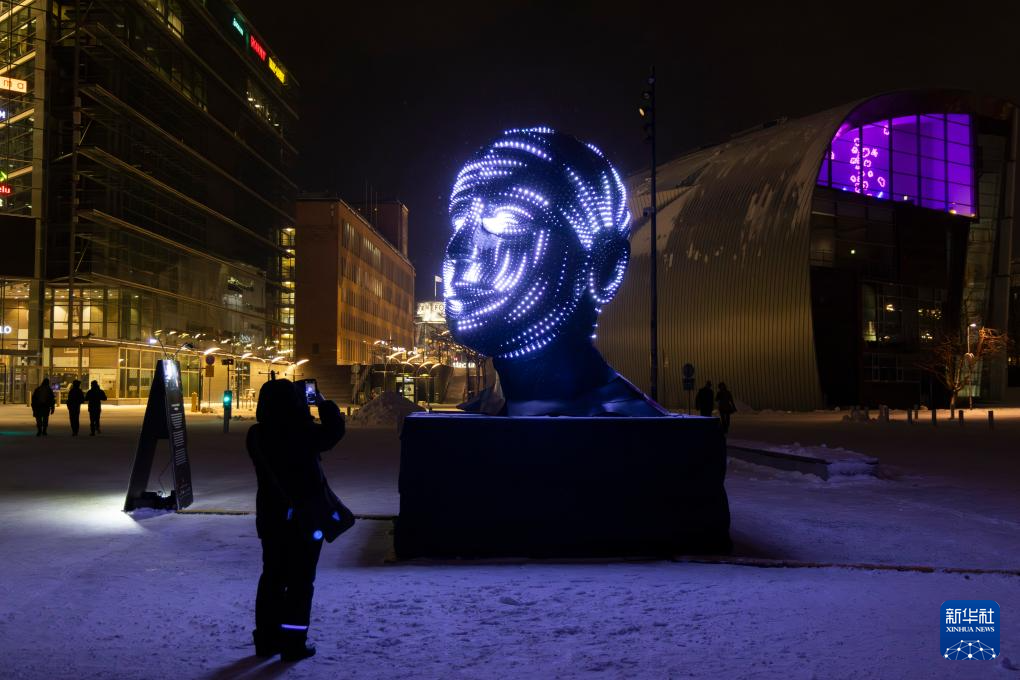 这是1月3日在芬兰赫尔辛基拍摄的一座灯光装置。