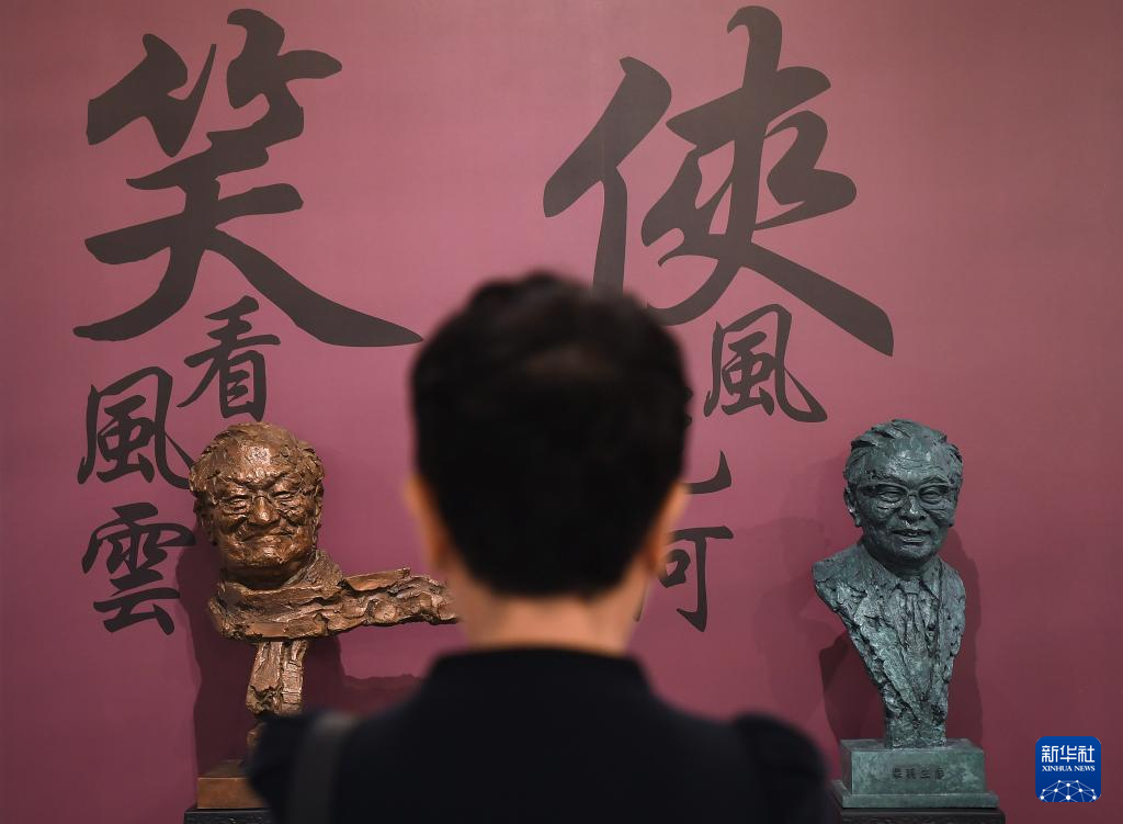 5月11日,观众在南来作家手迹遗物展上拍摄武侠作家金庸和梁羽生的雕塑。