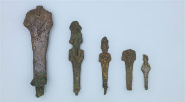 这是在埃及卢克索拍摄的中埃卢克索孟图神庙联合考古项目发掘出土的不同尺寸的奥西里斯神铜像(2020年3月28日摄)。
