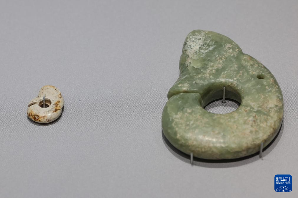 6月8日在“文明之光——红山·良渚与中华文明”主题展览上拍摄的红山文化玉箍形器。