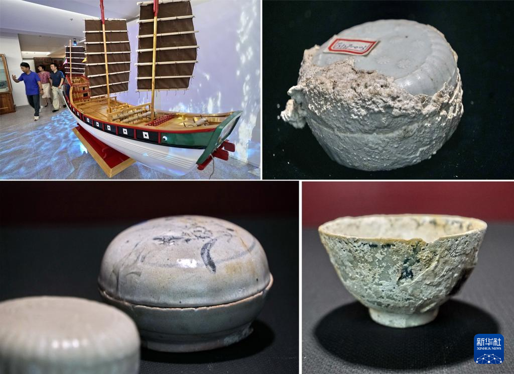 拼版照片:左上图为“泰兴号”沉船的复制模型(8月31日摄);其他图均为展出的清代瓷器(8月31日摄)。