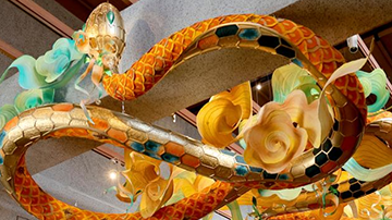 1月6日,在哈尔滨太阳岛雪博会园区,游客观赏本届雪博会主塑《雪艳春》(无人机照片)。《雪艳春》以“百鸟朝凤”为灵感源泉,鸟与梅花元素相互交织,长100米,高30米。