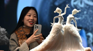 1月13日,在哈尔滨太阳岛雪博会园区,游客在大型雪雕《雪韵国粹青花瓷》下留影。