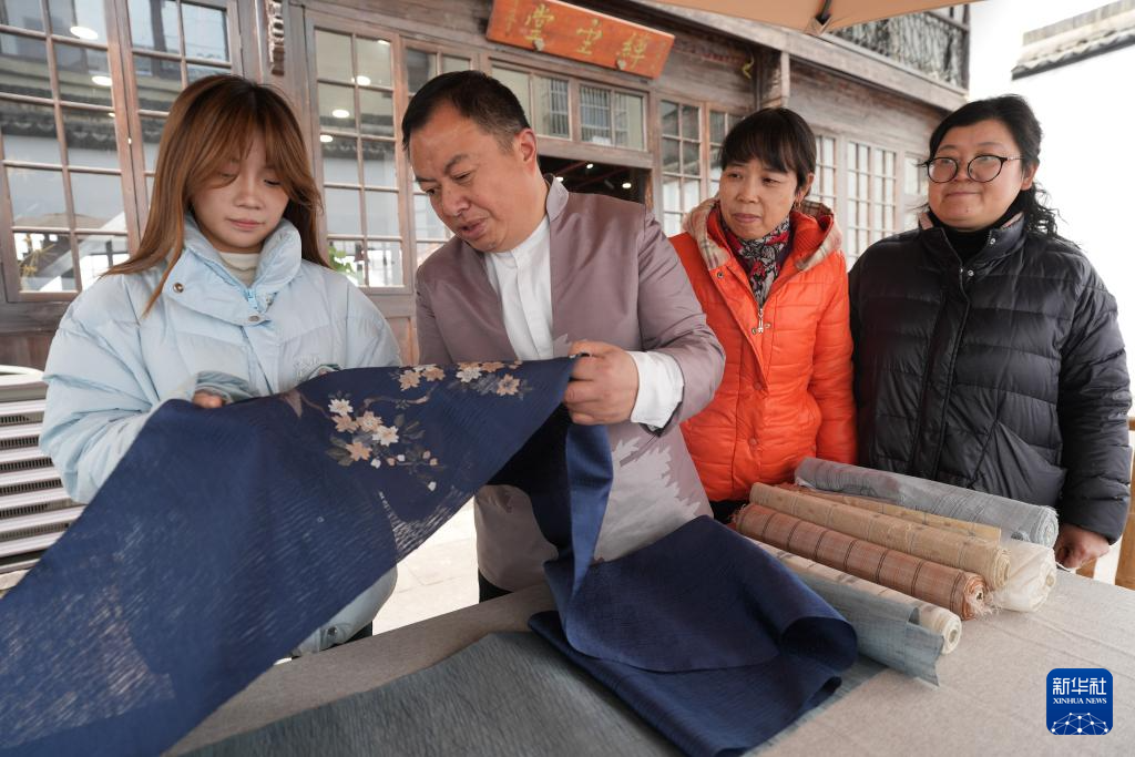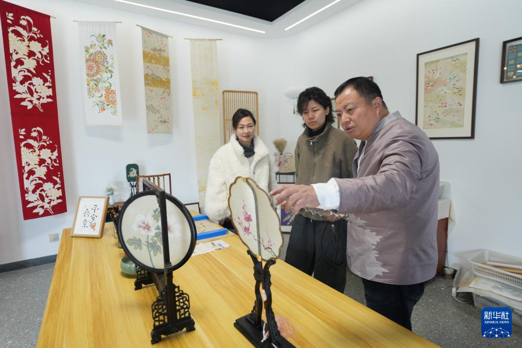 2月19日,柯翔祥(右一)在德清莫干山镇由蚕种场改造的丝绸技艺展示馆给来访者介绍缂丝制作的文创产品。