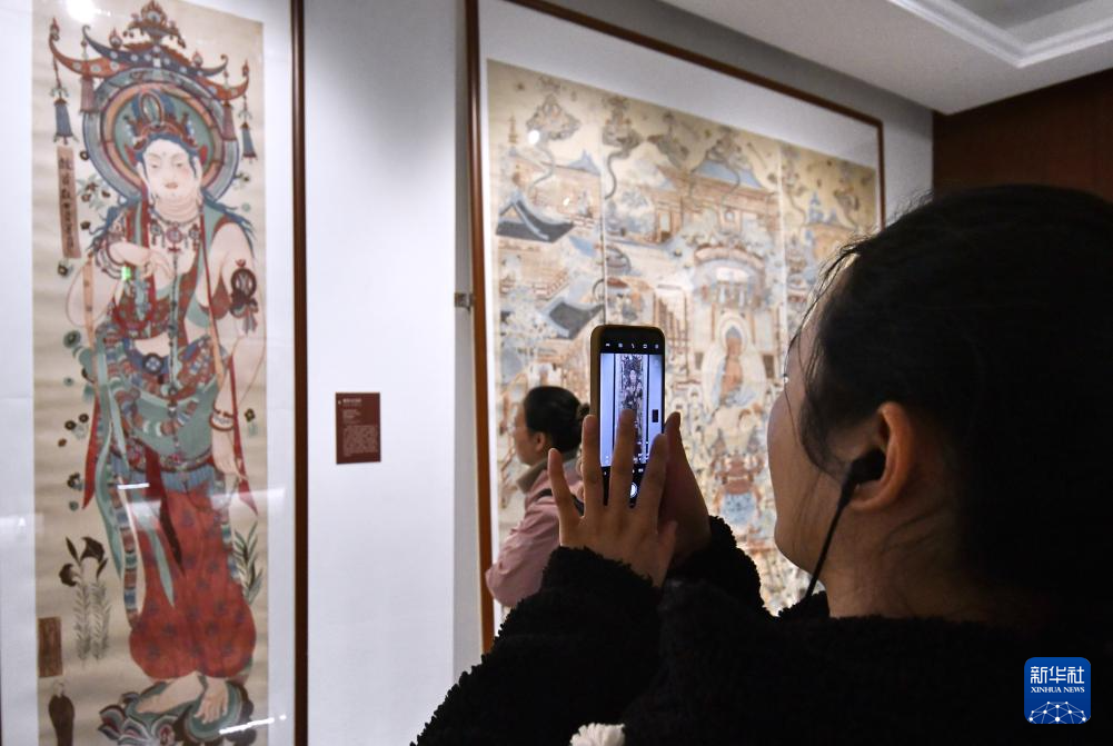 3月29日,观众在参观“如是莫高”敦煌艺术大展中展出的复刻壁画。