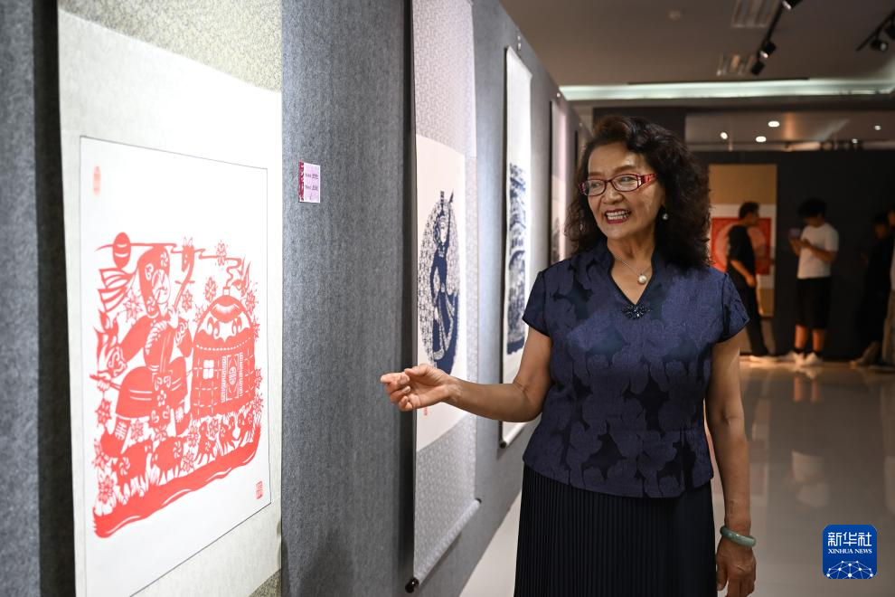 6月20日,和林格尔剪纸国家级代表性传承人段建珺(右)在呼和浩特职业学院美术馆向嘉宾介绍剪纸作品。