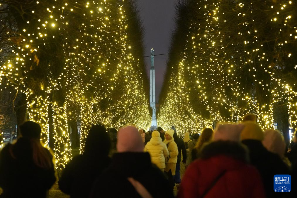 11月17日,民众在拉脱维亚首都里加举行的灯光节上欣赏滨海公园的灯光艺术装置。