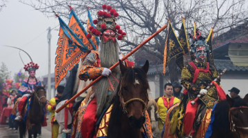 3月1日,甘肃省白银市会宁县会师镇北关社火队在会宁县城进行高跷巡演。