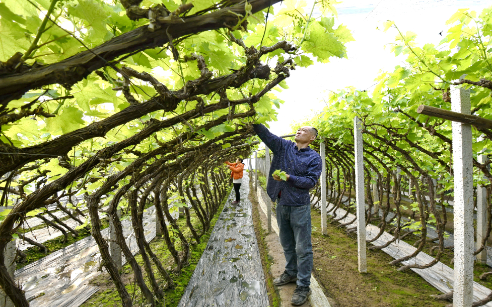 2026年2月4日,河北省唐山海港经济开发区王滩镇的农民在管护大棚葡萄。新华社记者 杨世尧 摄