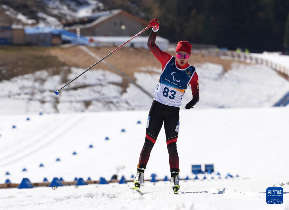 当地时间3月7日,在意大利泰塞罗举行的米兰-科尔蒂纳冬残奥会冬季两项男子短距离(站姿)比赛中,中国选手蔡佳云获得冠军。
