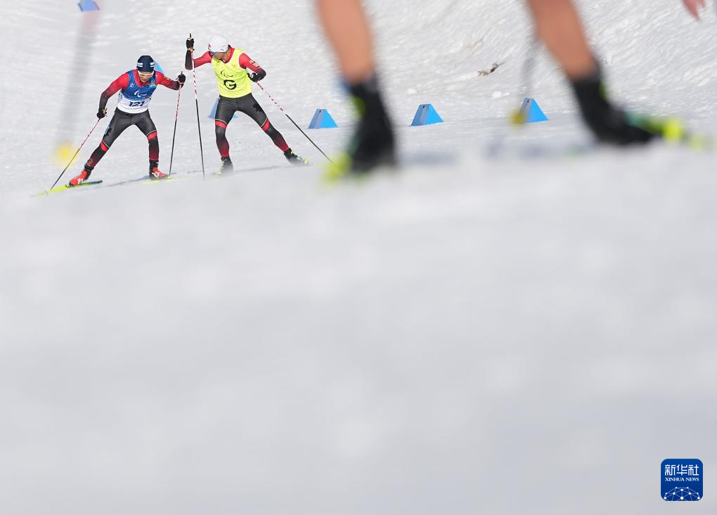 3月8日,中国选手党鹤松(左)与引导员卢宏达在比赛中。