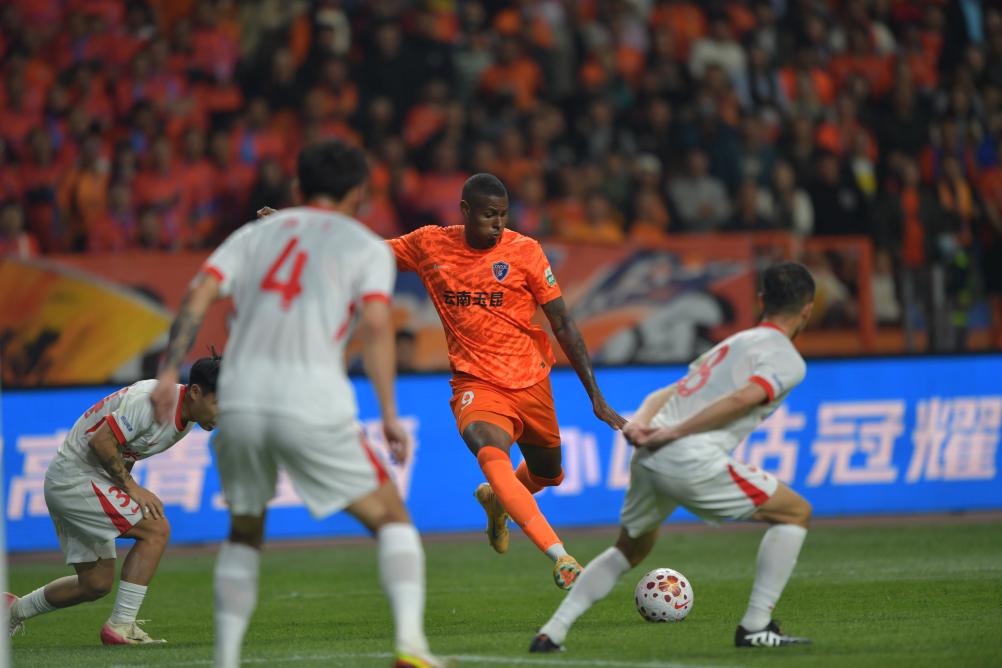 3月7日,云南玉昆队球员克莱伯(右二)在与青岛海牛队的比赛中射门。新华社记者 陈欣波 摄