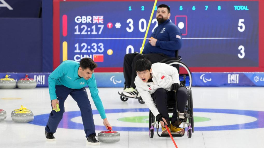 冬残奥会——轮椅冰壶混双小组赛:中国队胜英国队