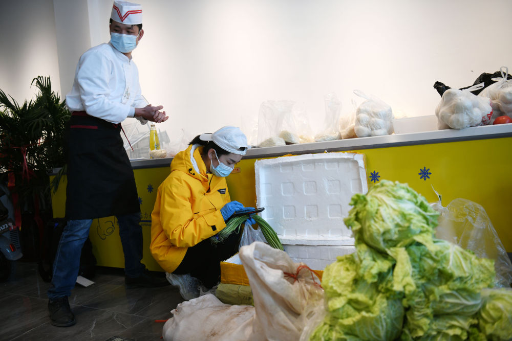 ↑1月11日,汪新建(左)和張琪琪夫婦在準備給鄰居們送菜。生活在河北石家莊市玉蘭苑小區的夫婦二人,在小區門口開了一家餐廳,夫妻倆帶著廚師和司機,為社區的工作人員免費提供盒飯,義務給鄰居們跑腿買菜。