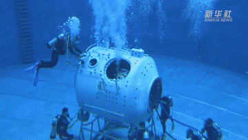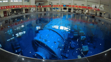 這里是航天員模擬失重水槽訓練場。當飛船繞地心運動時,會產生失重。航天員要在失重狀態下進行空間出艙活動和裝配維修等任務。實踐證明,模擬失重水槽訓練是在地面上進行航天員艙外活動訓練的最為有效方法。