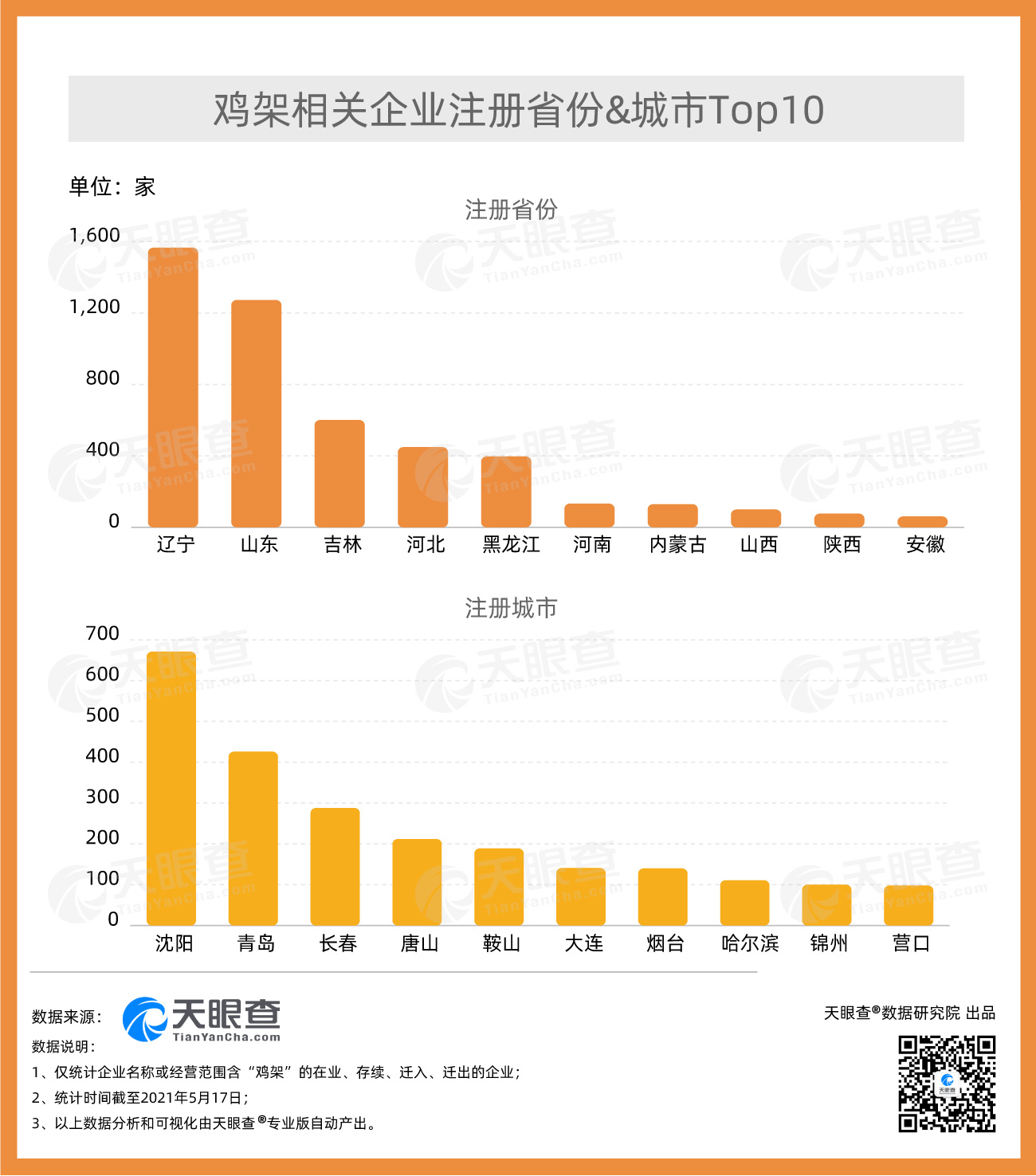????? 從地域分布上看,遼寧的雞架相關企業數量最多,有近1,600家,占全國近3成。其次為山東,有1,200余家雞架相關企業。分城市來看,沈陽以670余家雞架相關企業位居全國首位,其次為青島,有400余家相關企業。天眼查數據顯示,近年來我國雞架相關企業年注冊量整體呈現上漲趨勢。2019年,我國新增2,200余家雞架相關企業,年注冊量達到歷史最高。2020年,我國新增近2,000家雞架相關企業。