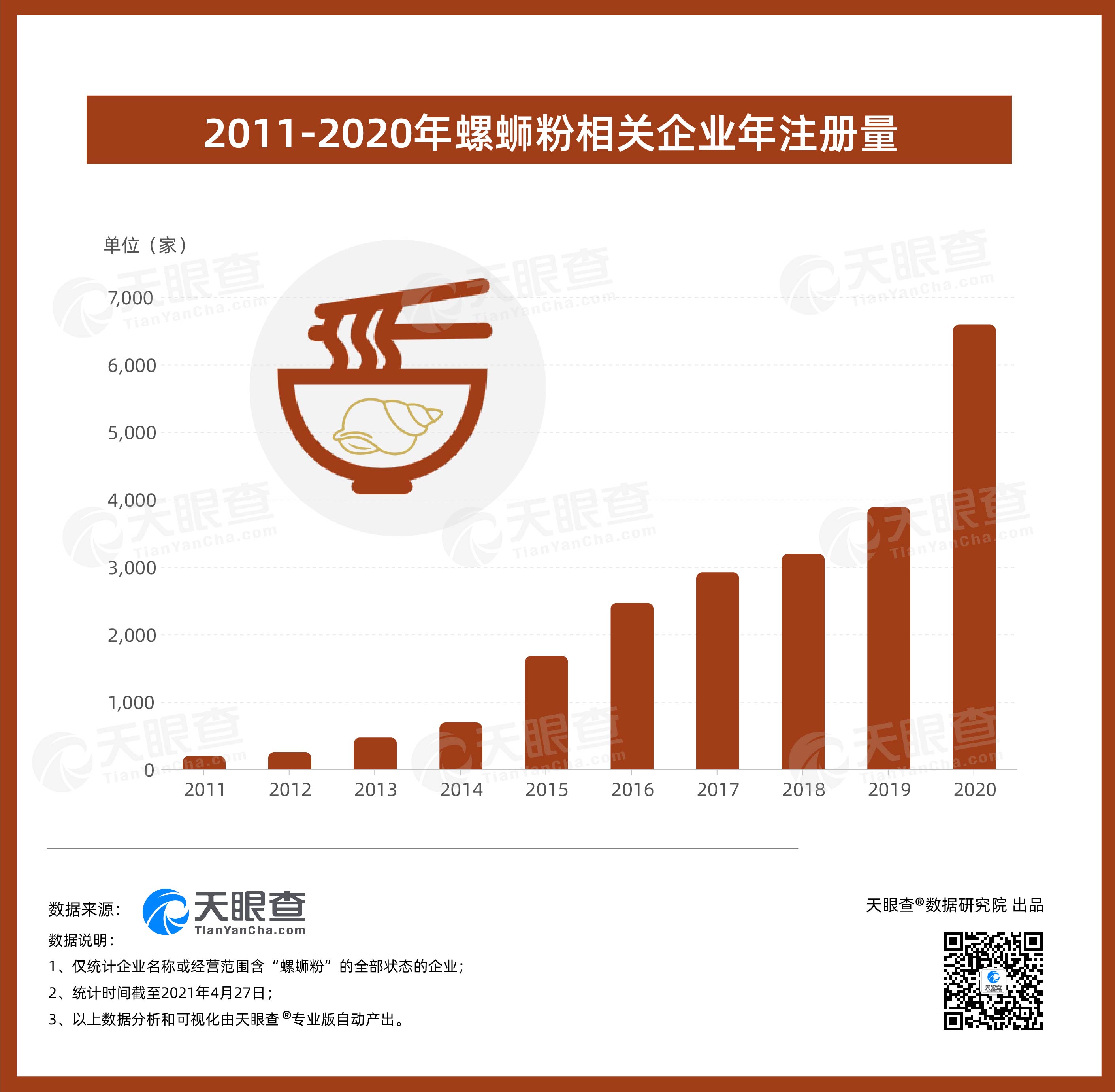 ????? 從地區分布來看,廣西的螺螄粉相關企業數量最多,超過5,300家。其中,柳州市擁有超過1100家螺螄粉相關企業,占全國的6%。此外,廣東以超4,800家相關企業數量位居第二,河南和湖南也分別有超過1,000家相關企業。值得一提的是,近五年來,我國螺螄粉相關企業(全部企業狀態)年注冊量整體呈現上漲趨勢,年增速保持在30%以上。其中,2020年新增相關企業數量最多,超過6,500家,同比增長70%。