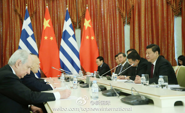 ????新華網北京2月7日電 據新華社“新國際”微博報道,習近平7日在索契會見希臘總統帕普利亞斯時表示,中希雙方要擴大多領域合作,特別是共同搞好中方參與經營希臘比雷埃夫斯港口項目,為兩國投資合作起到良好示范和帶動作用。雙方要加強人文交流和旅游合作,促進文明對話互鑒。