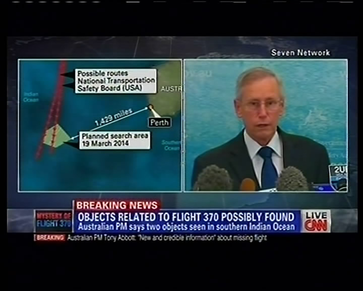 ??? 澳方稱在印度洋中發(fā)現(xiàn)了可能與馬航失聯(lián)客機(jī)有關(guān)物體這張3月20日拍攝的CNN視頻截圖顯示,澳大利亞海事安全局官員在堪培拉召開(kāi)的新聞發(fā)布會(huì)上發(fā)言。澳大利亞總理阿博特當(dāng)日在議會(huì)說(shuō),澳方在印度洋中發(fā)現(xiàn)了可能與馬航失聯(lián)客機(jī)有關(guān)的兩個(gè)物體。澳大利亞海事安全局官員當(dāng)日說(shuō),發(fā)現(xiàn)可疑碎片的位置與之前確定的馬航失聯(lián)客機(jī)南部搜尋航道高度吻合,但當(dāng)?shù)睾S蛩沫h(huán)境非常差。新華社發(fā)