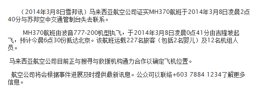 ????這份聲明標(biāo)記的時(shí)間為3月24日晚上10時(shí)15分。而在3月8日,馬航發(fā)表的聲明則表示“該航班運(yùn)載227名旅客(包括2名嬰兒)及12名機(jī)組人員。”