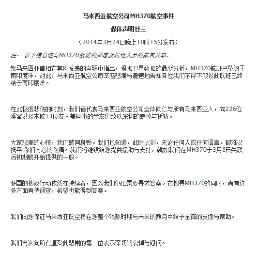 ????馬航官方網(wǎng)站上的《媒體聲明廿三》表示,“在此極度悲傷的時(shí)刻,我們謹(jǐn)代表馬來(lái)西亞航空公司全體同仁與所有馬來(lái)西亞人,向226位乘客以及本航13位友人兼同事的親友們致以深切的哀悼與祈禱。”