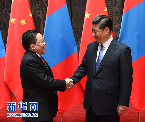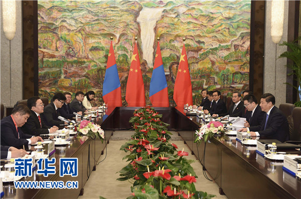 習近平強調,我十分關心和高度重視中蒙關系。兩國領導人要保持密切交往和戰略溝通,實實在在推進兩國合作。兩國立法機構、政黨、軍隊也要加強交往。中蒙經濟互補性強。中方開展對蒙合作堅持互利雙贏原則,不搞我贏你輸、我多你少。中方愿本著礦產資源開發、基礎設施建設、金融合作“三位一體、統籌推進”原則,以互聯互通建設為優先方向,以建設絲綢之路經濟帶為契機,拓展兩國合作,鼓勵有實力的中國企業赴蒙投資興業。中方支持蒙方積極參與國際和地區事務,愿同蒙方加強在聯合國、上海合作組織等框架內合作。