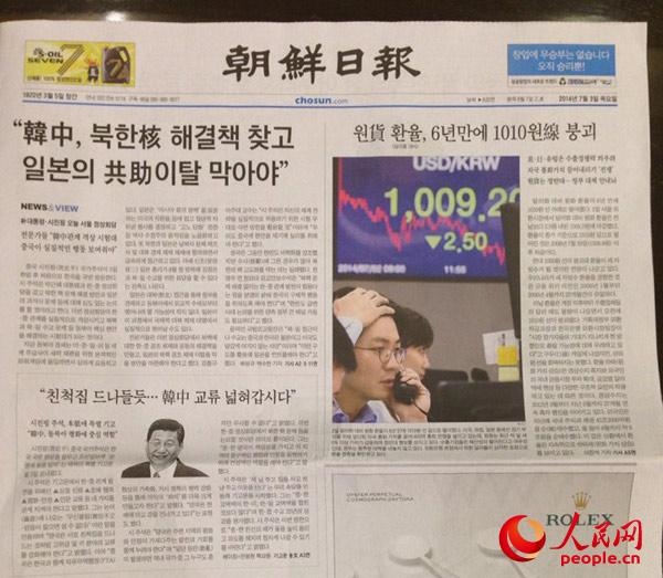 ??? 韓國《朝鮮日報》在頭版顯著位置刊發習近平主席署名文章《中韓自古好鄰居 兩國友好風好正揚帆》 金慧廷 攝