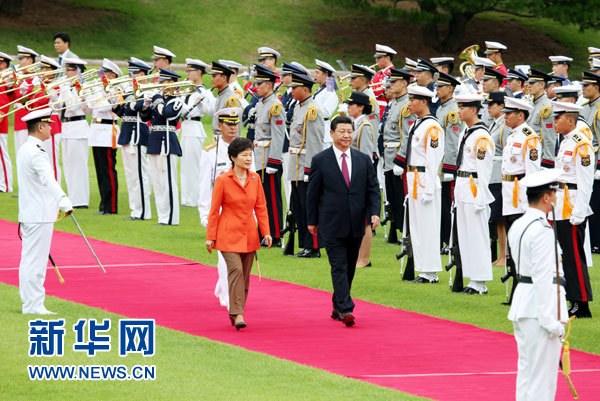 ??? 7月3日,國家主席習近平在首爾同韓國總統樸槿惠舉行會談。會談前,樸槿惠在青瓦臺總統府為習近平舉行隆重歡迎儀式。 新華社記者姚大偉攝