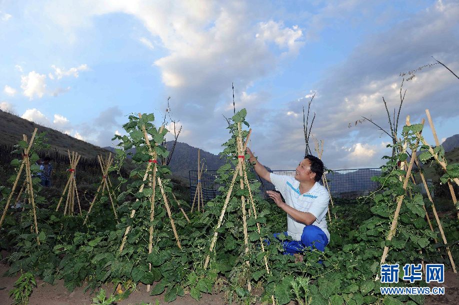 ????7月5日,烏茲別克斯坦安革連至琶布鐵路隧道項目安革連隧道進口西口分部生活區,杜潮停在菜地查看豆角長勢。(沙達提 攝)