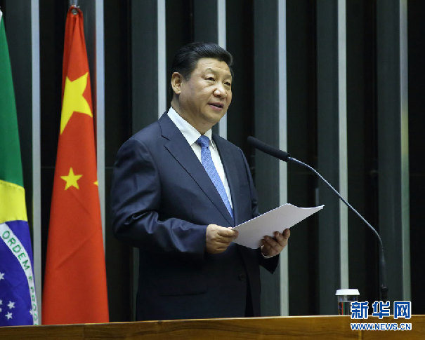 ??? 7月16日,國家主席習近平在巴西國會發(fā)表《弘揚傳統(tǒng)友好共譜合作新篇》的演講。 新華社記者蘭紅光攝