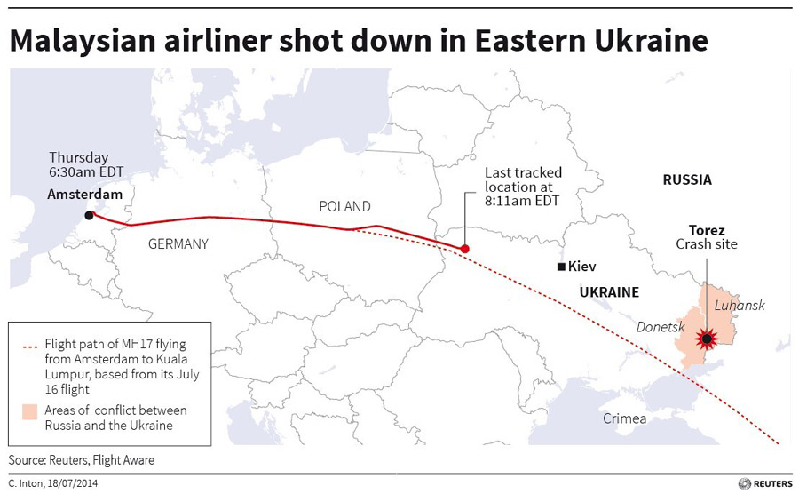 當?shù)貢r間7月17日,一架從阿姆斯特丹起飛的馬航客機在烏克蘭領(lǐng)空與地面失去聯(lián)系。這架飛機墜毀在烏克蘭頓涅茨克州斯涅日諾耶居民點附近,機上298人全部遇難。英國路透社繪制了一張客機路線圖。