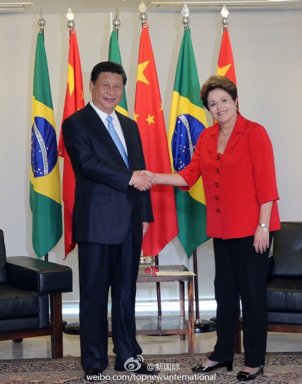 ??? 據新華社“新國際”微博報道,習近平17日與巴西總統羅塞夫會談時表示,中巴政治和戰略互信達到前所未有的高水平,利益聯系達到前所未有的緊密程度,兩國已經成為命運共同體。雙方應該加強交流合作,共同維護發展中國家共同利益,推動國際力量對比朝著更加均衡方向發展。(蘭紅光攝)