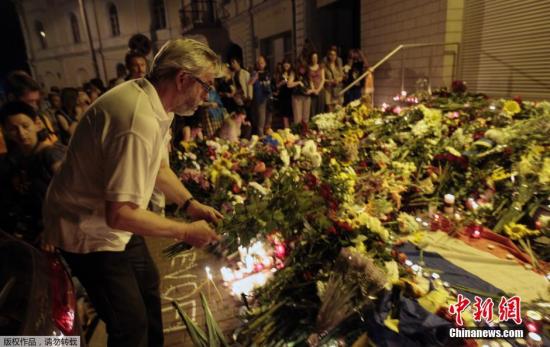 7月17日,烏克蘭基輔,民眾們手持鮮花和蠟燭在荷蘭駐烏大使館前悼念馬航MH17事故遇難者。