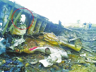 從這張殘骸照片來看,機身上有比臉盆略大的孔洞,破壞方向從機體外部沖向內(nèi)部,懷疑是導(dǎo)彈的戰(zhàn)斗部碎片擊中的一塊區(qū)域。