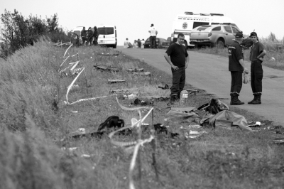 一些記者19日看到民間武裝人員把裝有遺體的袋子裝入卡車,隨后運(yùn)離墜機(jī)現(xiàn)場(chǎng)。截至昨天,全部遺體都已從現(xiàn)場(chǎng)被運(yùn)走,用于標(biāo)記遺體位置的系著白布的小木棍不見蹤影,而緊急情況應(yīng)對(duì)人員繼續(xù)在現(xiàn)場(chǎng)搜集殘骸。