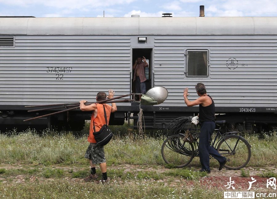 當地時間2014年7月20日,烏克蘭頓涅茨克Torez,馬航墜機遇難乘客遺體被裝上列車冷藏車廂將被運走。載有部分遺體的火車從距空難現場不遠的烏克蘭托列茲市出發,前往頓涅茨克市。火車離站前,身處空難現場的歐洲安全與合作組織(歐安組織)代表檢查了運載遺體的5節冷藏車廂。
