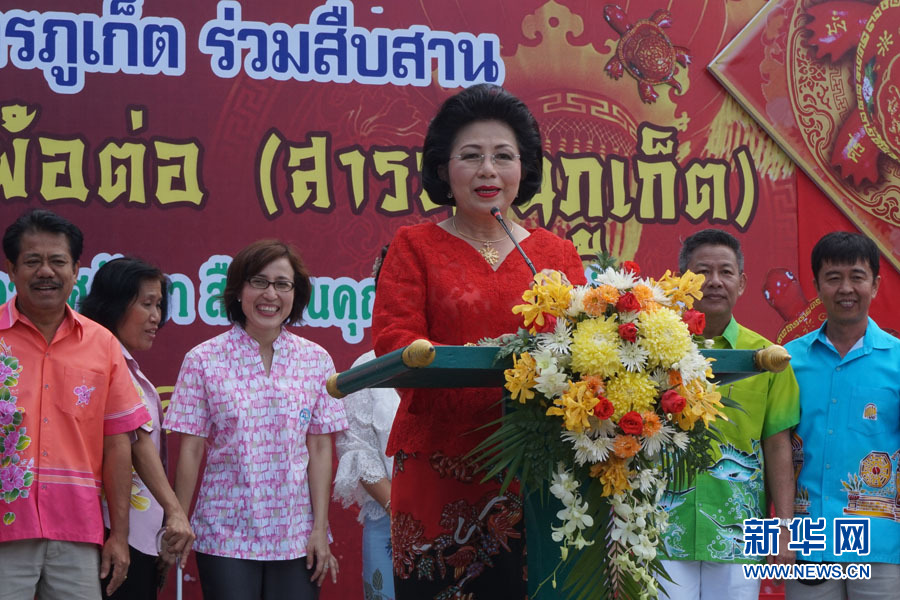 ????8月12日,泰國普吉府舉辦中國傳統的“中元普渡”活動,以普渡孤魂,表達仁愛和孝道思想。該活動在普吉已有150多年的歷史,每逢中國農歷7月,當地華人便會舉行祭祀儀式,用面粉和糖制成大小不一的紅色面團,裝飾成烏龜形狀,既表達了對于祖先的懷念,還傳遞了對于全家人健康長壽的祝福。圖為普吉府普吉市市長頌齋(中)在活動開幕式上。新華網記者 楊云燕 攝