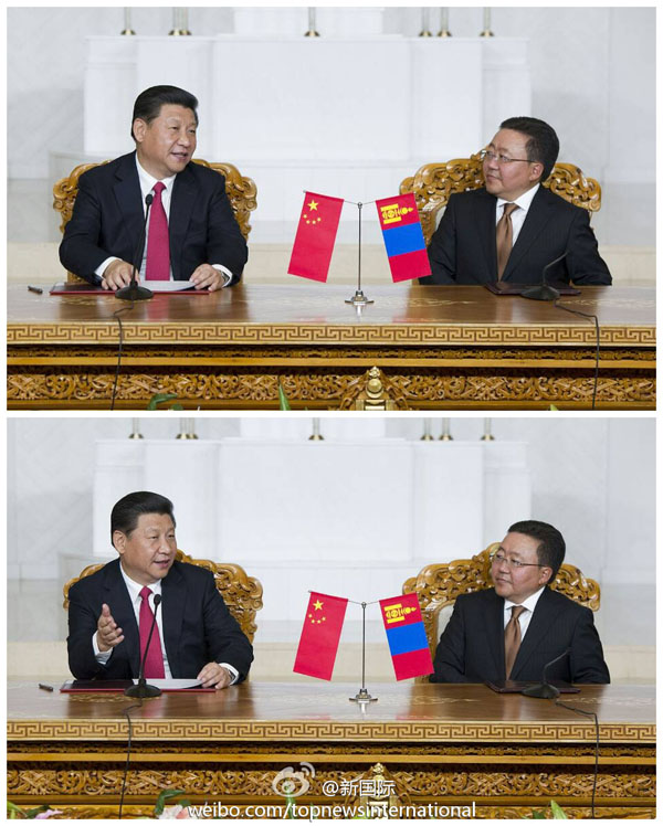 ????新華網北京8月21日電 據新華社“新國際”微博報道,習近平主席21日同蒙古國總統額勒貝格道爾吉會見記者時說,為將中蒙全面戰略伙伴關系落到實處,中蒙兩國將全面擴大經貿務實合作,爭取到2020年實現雙邊貿易額100億美元的目標,同時要把互聯互通和大項目合作作為兩國合作的優先方向。