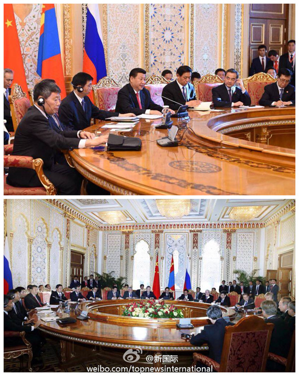 ????新華網北京9月12日電 據新華社“新國際”微博報道,國家主席習近平11日在出席中俄蒙三國元首會晤時說,中方提出共建絲綢之路經濟帶倡議,獲得俄方和蒙方積極響應。我們可以把絲綢之路經濟帶同俄羅斯跨歐亞大鐵路、蒙古國草原之路倡議進行對接,打造中蒙俄經濟走廊。