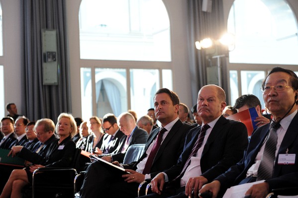 ????盧森堡首相貝特爾(右三)、漢堡市市長舍爾茨(右二)、中國工業經濟聯合會會長李毅中(右一)出席第六屆漢堡峰會開幕式。新華社記者商婧攝