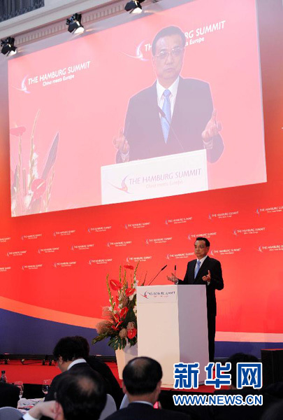 ??? 當(dāng)?shù)貢r(shí)間10月11日中午,國(guó)務(wù)院總理李克強(qiáng)在漢堡出席中歐論壇漢堡峰會(huì)第六屆會(huì)議并發(fā)表題為《樹立互利共贏的新標(biāo)桿》的主旨演講。新華社記者 饒愛民 攝