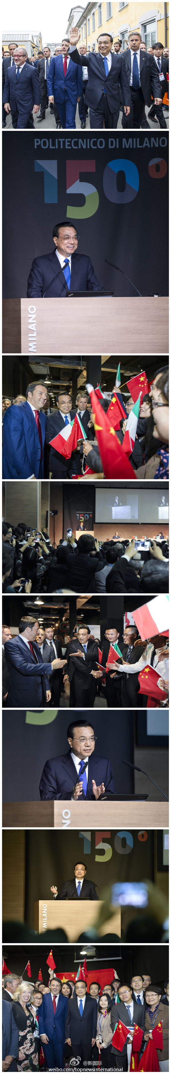 ????新華網北京10月16日電 據新華社“新國際”微博報道,李克強總理16日上午來到意大利著名的米蘭理工大學出席中意創新周大會。校園里,師生們揮舞著兩國國旗,歡呼迎接李克強的到來,其中有不少中國留學生。他們掏出手機拍個不停。李克強熱情地同大家打招呼、握手。