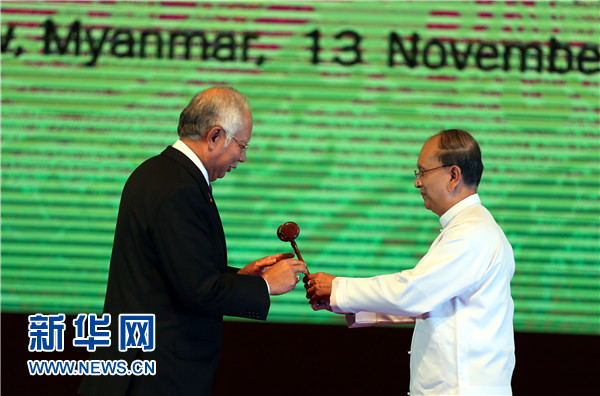 ????閉幕式上,馬來西亞總理納吉布從吳登盛手中接過象征東盟輪值主席國職權(quán)的金色木槌。馬來西亞將成為2015年東盟輪值主席國。