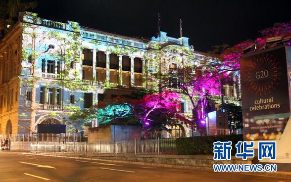 ????這是11月15日在澳大利亞布里斯班拍攝的夜景。當日,二十國集團領導人第九次峰會在澳大利亞布里斯班舉行。入夜,布里斯班街頭部分建筑披上了彩色的“外衣”。 新華社記者 趙丹惠 攝