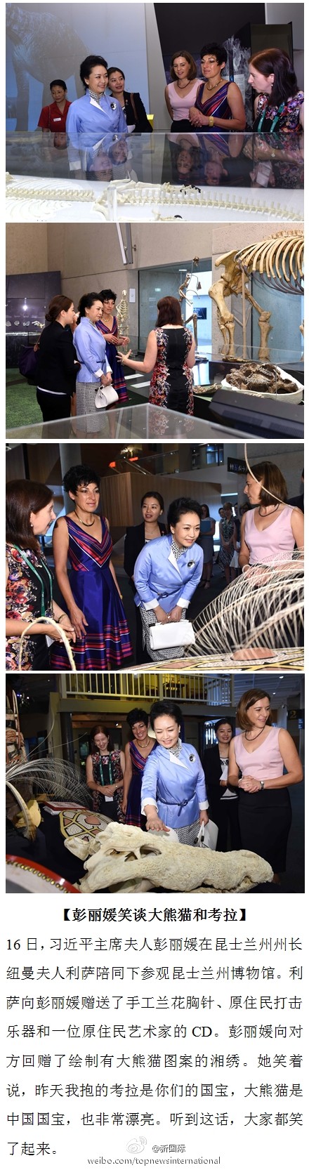 ????新華網(wǎng)北京11月16日電 據(jù)新華社“新國(guó)際”微博報(bào)道,16日,習(xí)近平主席夫人彭麗媛在澳大利亞昆士蘭州州長(zhǎng)紐曼夫人利薩陪同下參觀昆士蘭州博物館。